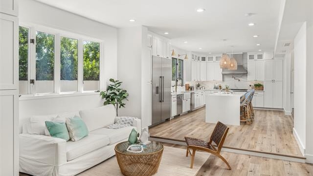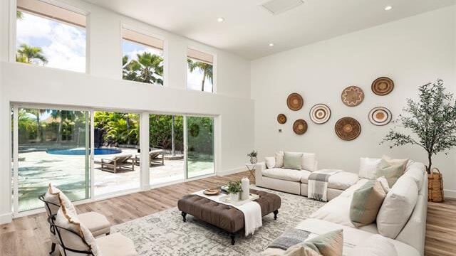 大きな光が差し込む窓と、大きなプール、スパ、滝を見渡す大きな屋外ベランダにつながる日光が差し込むガラスのスライドドアを備えた複数のラウンジとリビングスペースをお楽しみください。